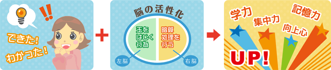 そろばんの玉をはじくという行為が左脳に働き、暗算するということが右脳に働きます。